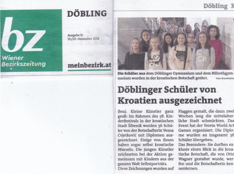 Municipality Döbling Newspaper article about reception in the Croatian Embassy to Austria and honoring the pupils of two schools for participation on MDF in Sibenik in 2018 with their "flag self portraits".